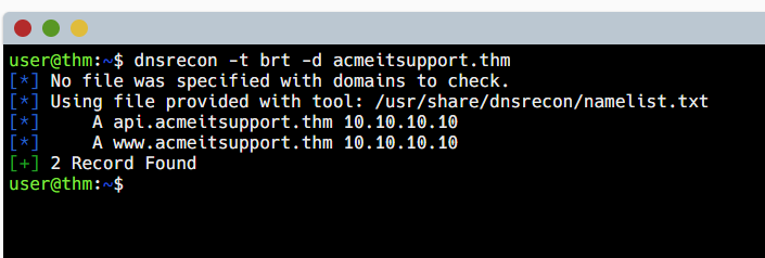 这里靶场介绍的是dnsracon这款工具,利用子域名字典对指定url进行探测,查询DNS服务器中是否有此子域名解析记录。