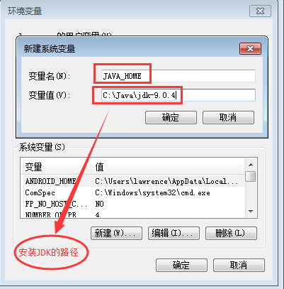 5)变量名: JAVA_HOME,变量值:JDK安装路径 ,我的JDK安装路径C:\Java\jdk-9.0.4 ,然后 确定