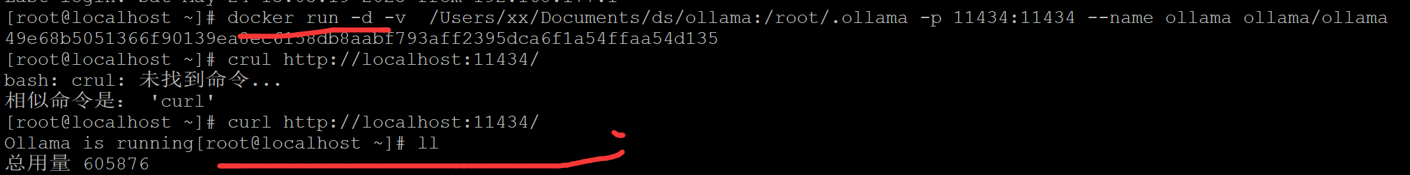 docker run -d -v /Users/xx/Documents/ds/ollama:/root/.ollama -p 11434:11434 --name ollama ollama/ollama