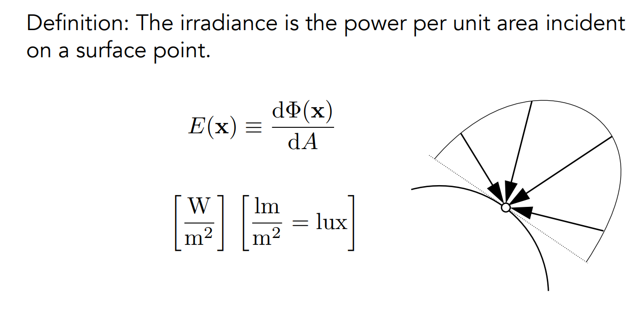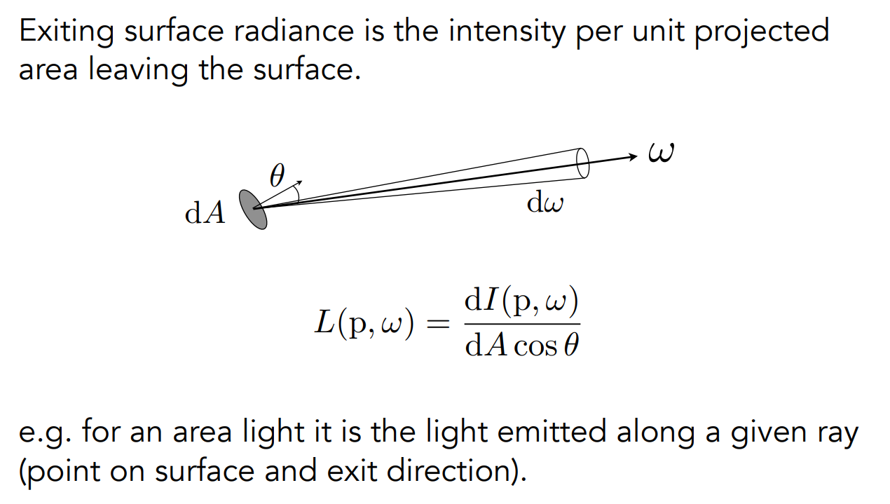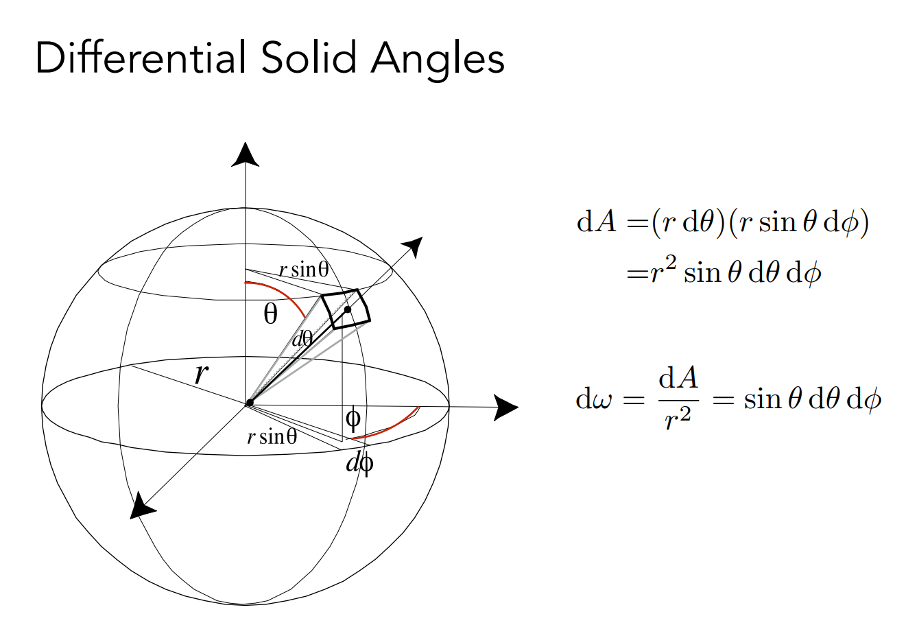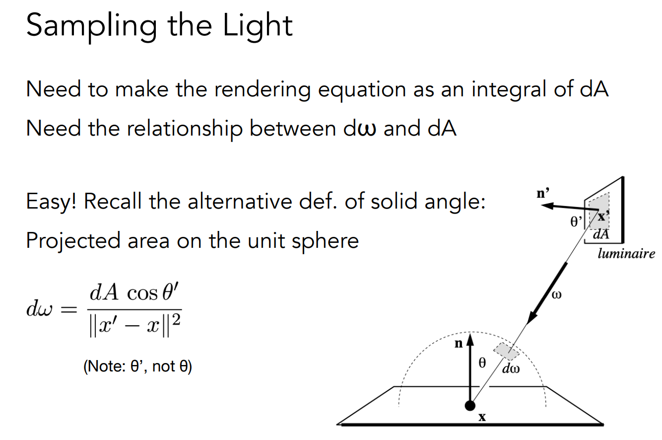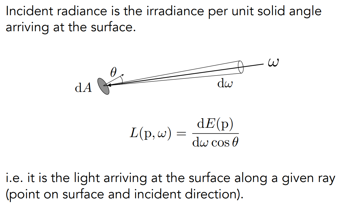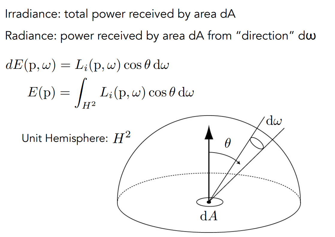 从某个方向看着色点,后三项为dA收到的能量irradiance