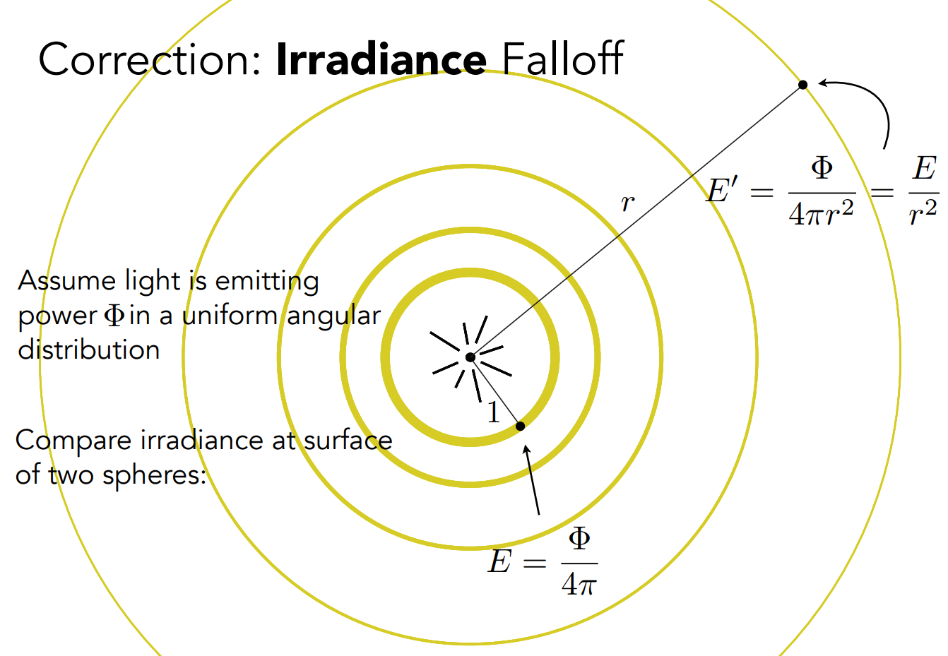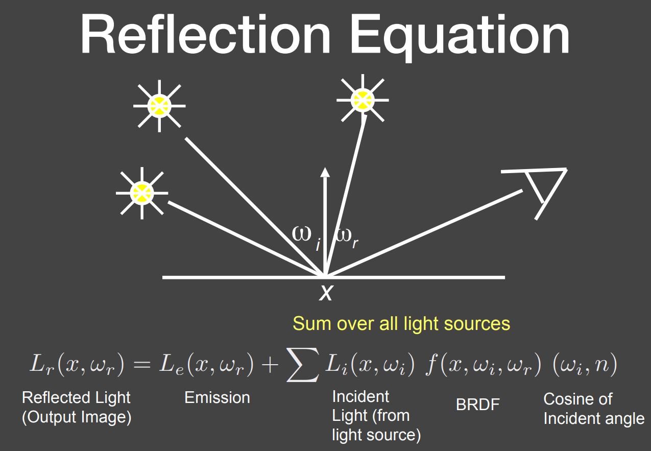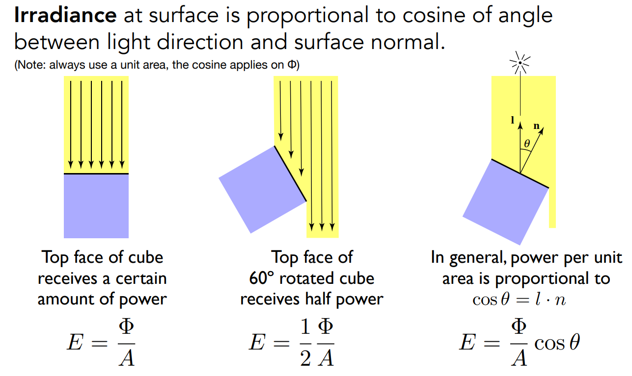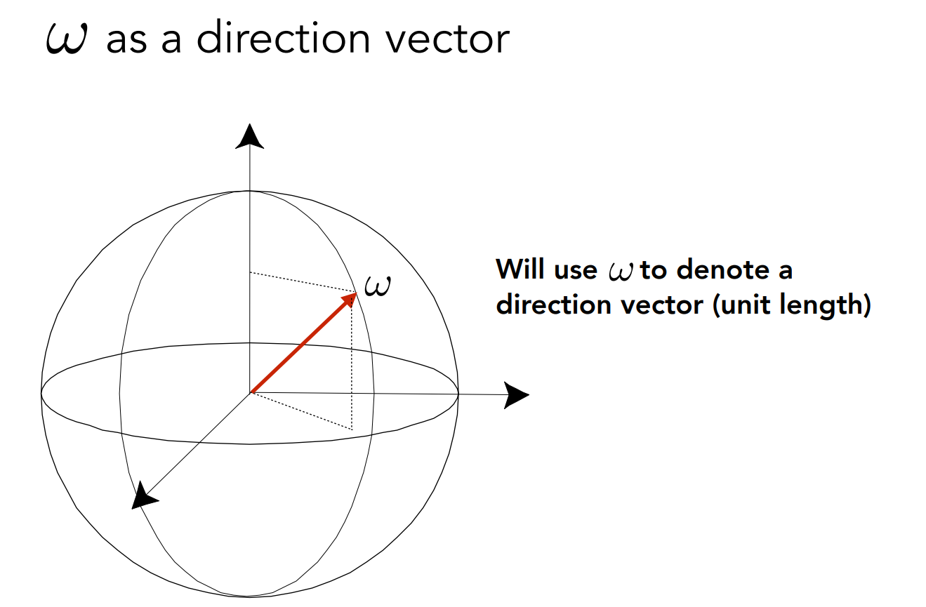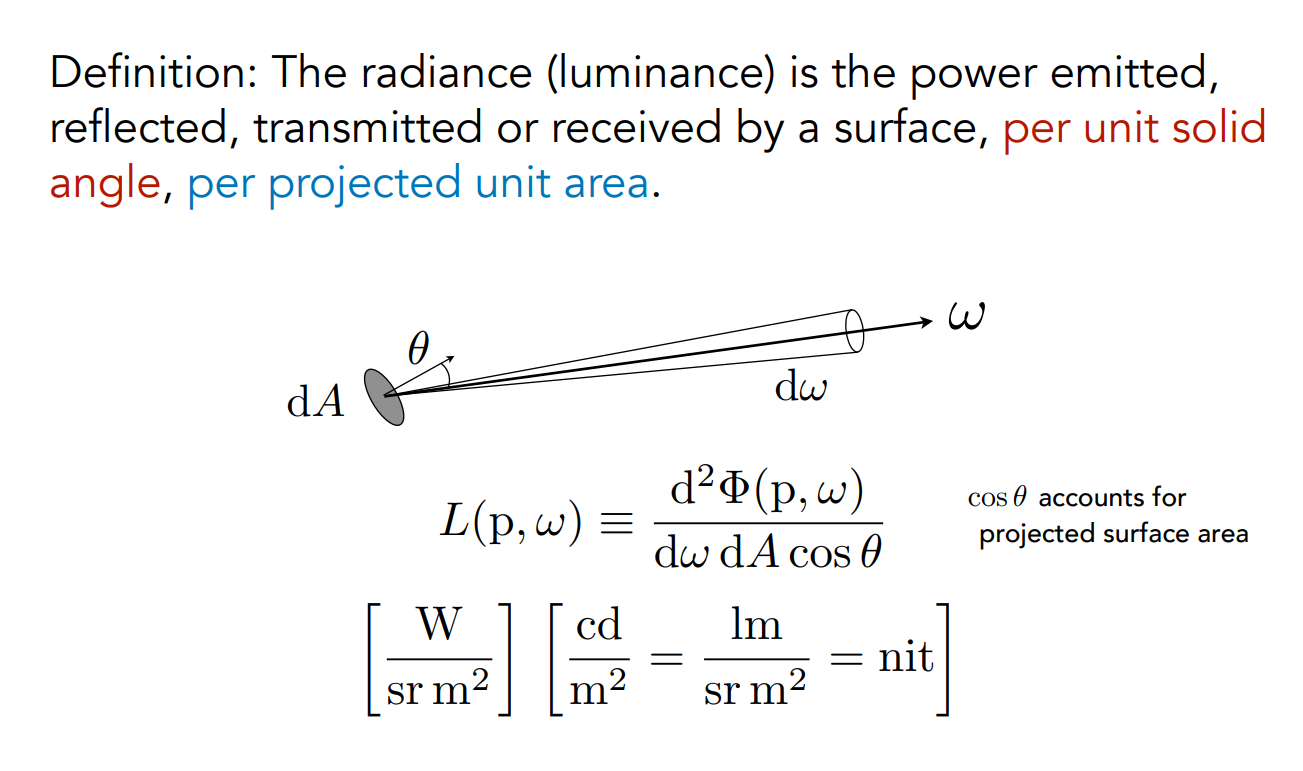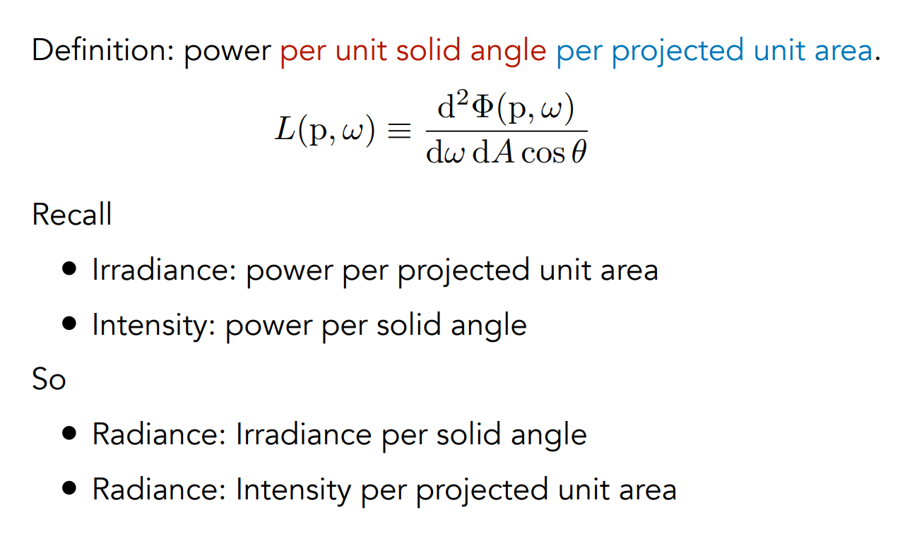 从某个方向看着色点,后三项为dA收到的能量irradiance
