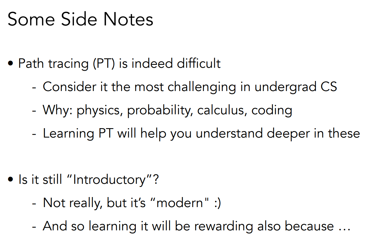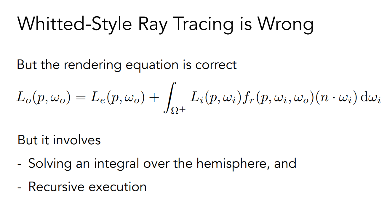 High level: let’s progressively improve upon Whitted-Style Ray Tracing and lead to our path tracing algorithm!