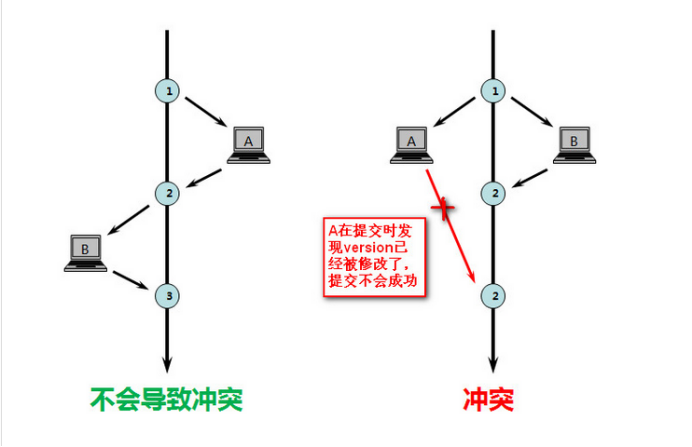 那么最后操作2修改了数据来提交的时候是以操作1同样的方式,当然最后肯定不能提交成功,因为他手里的版本号和现在数据库里的版本号不匹配;