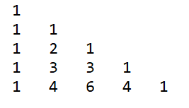 1 public class Example { 2 3 public static void main(String[] args) { 4 int a[][]= {{1}, 5 {1,1}, 6 {1,2,1}, 7 {1,3,3,1}, 8 {1,4,6,4,1}, 9 }; 10 for(int i=0; i<5; i++) { 11 for(int j=0; j<a[i].length; j++) { 12 System.out.printf("%4d", a[i][j]); 13 } 14 System.out.printf("%n"); 15 } 16 } 17 18 }