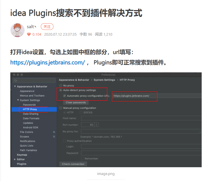 打开idea设置,勾选上如图中框的部分,url填写:https://plugins.jetbrains.com/ , Plugins即可正常搜索到插件。