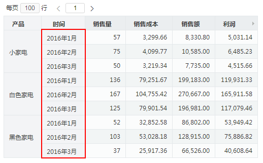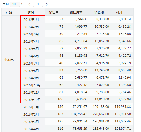 以下示例演示从"2016年01月"进行上钻操作后的效果。
