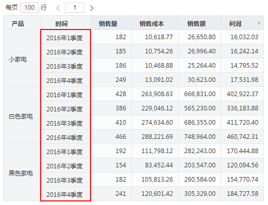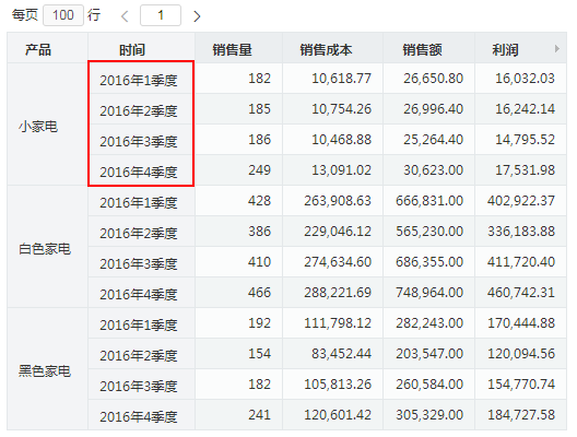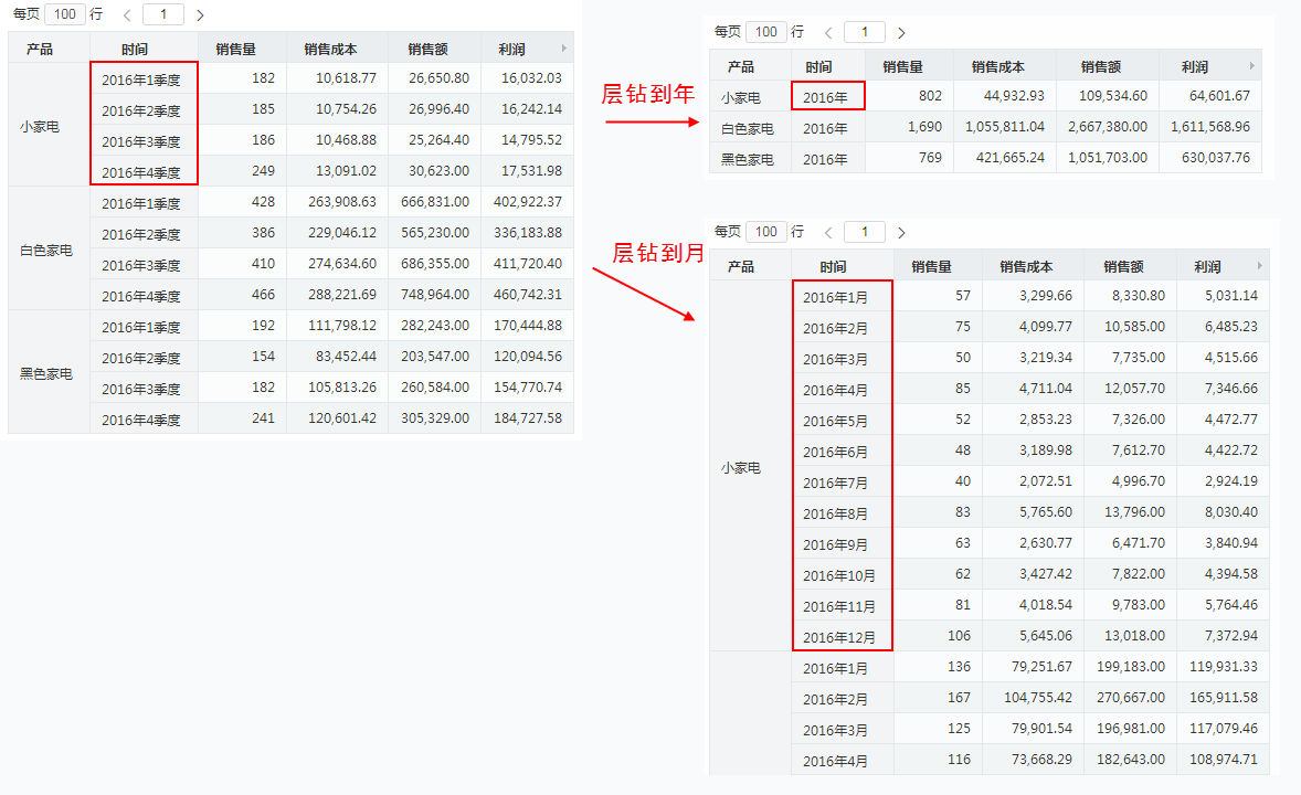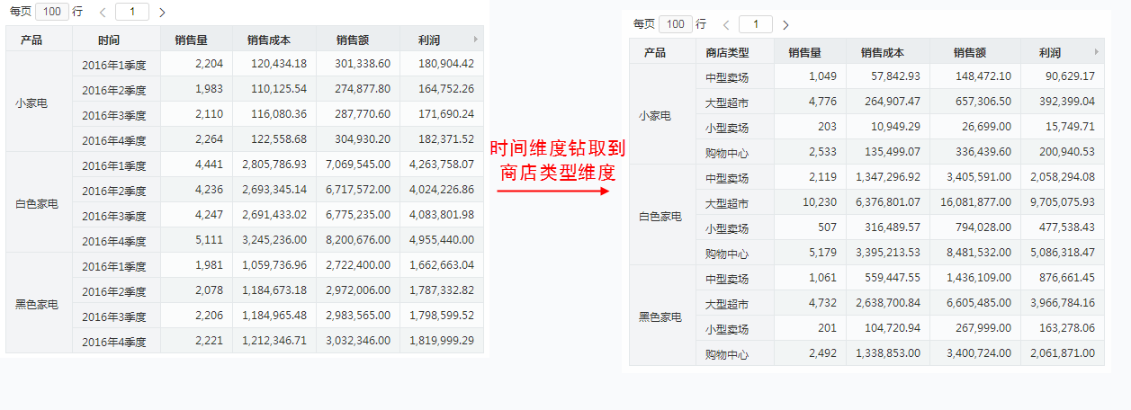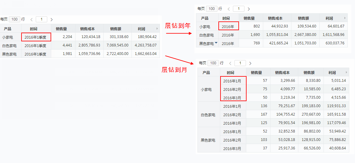 以下示例演示从“2016年1季”进行下钻操作后的效果。