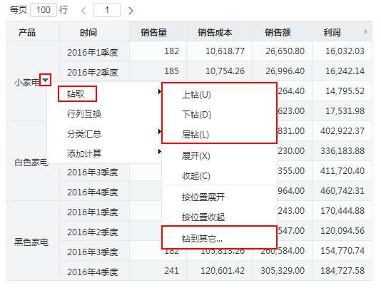 下钻:在当前多维分析表格区选中的维成员的更多菜单