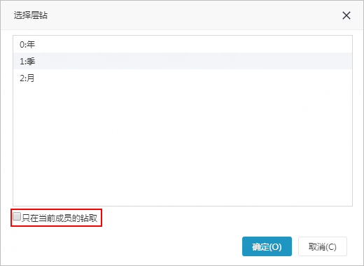 1. 在所有成员中层钻。在弹出的“选择层钻”窗口中取消勾选“只在当前成员的钻取”