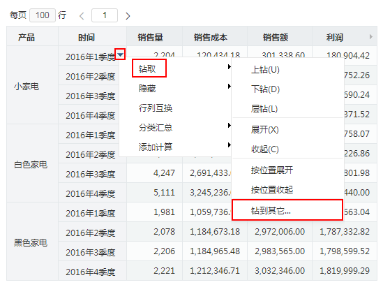 钻取到其它维度:在当前多维分析表格区选中的维成员的更多菜单