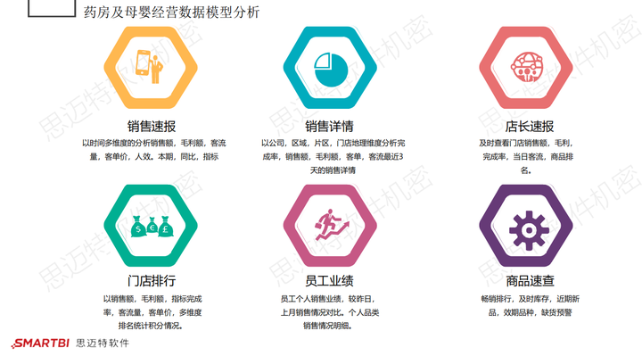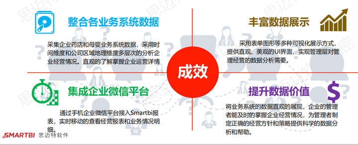 通过集团企业微信集成Samrtbi系统,在Smartbi平台在采集药店和母婴业务数据,整合企业经营业务系统,采用简单便捷的操作,用报表、图表、多维度分析展现等手段,分析企业经营的总体规模、成长性、盈利性、从时间和区域多维度分析实时运营情况,实现数据的可视化展示和分析挖掘,提升企业经营数据价值。给企业领导带来直观的经营数据和经营情况分析。
