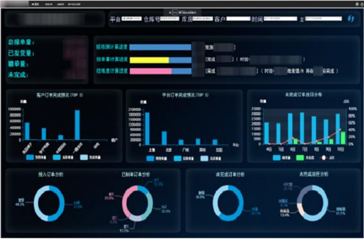 总接单量、已发货量、撤单量、未完成单量,不同维度的进度统计,不同客户的订单完成情况,不同平台的订单完成情况,每天的未完成订单情况,接入订单分析、已制单分析,未完成订单、未完成流程分析。