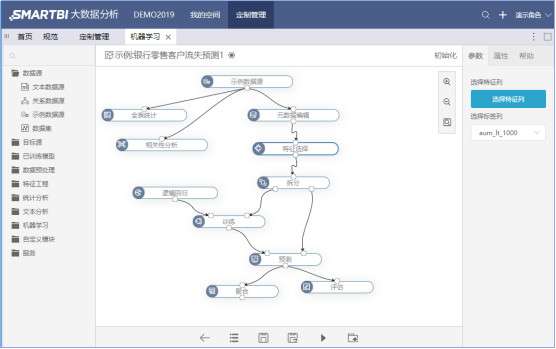 Smartbi 数据挖掘平台,不仅可为用户提供直观的流式建模、拖拽式操作和流程化、可视化的建模界面,还提供了大量的数据预处理操作。V9的机器学习算法,包含了分类、回归、聚类、预测、关联,5大类机器学习的成熟算法。从总体示意图上可以看到,Smartbi数据挖掘更向下沉降,提供ETL和数据计算读写能力,与传统BI、自助BI有很大的不同,可能更适合高级的数据分析师使用。