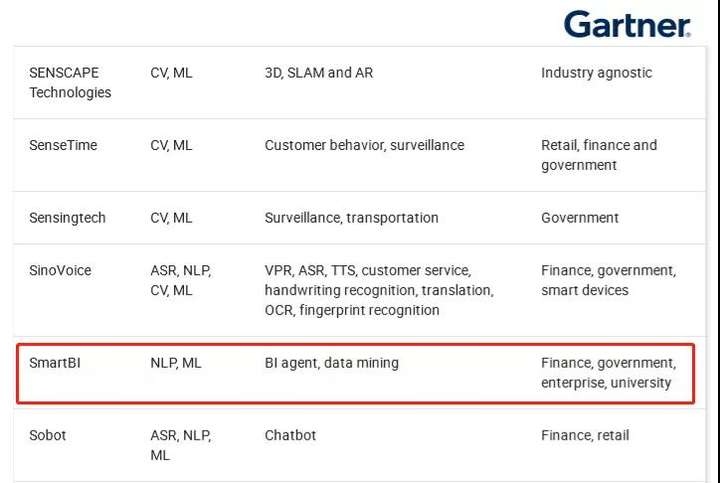 在今年Gartner发布的《中国人工智能创业公司竞争格局》报告(China Summary Translation: Competitive Landscape: AI Startups in China)中,Smartbi也成功入选中国人工智能创业公司代表名单(Representative List of AI Startups in China)。