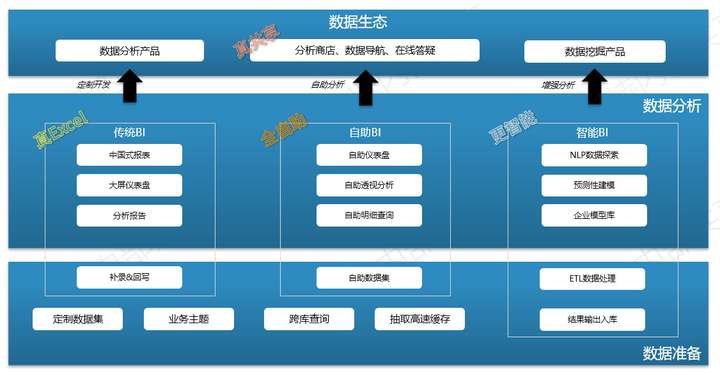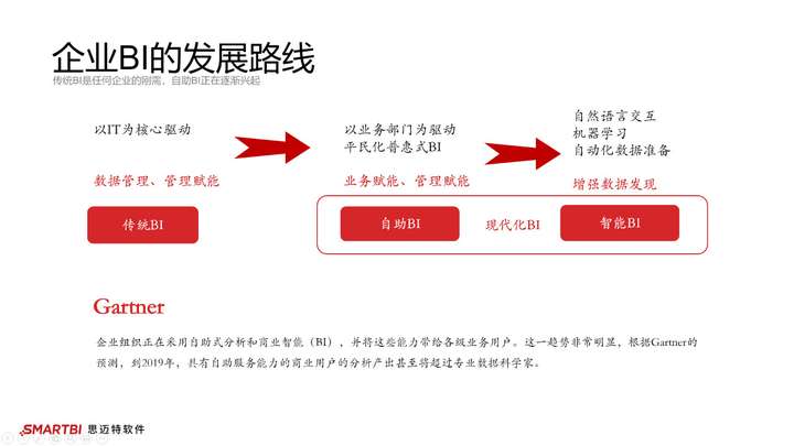 Smartbi的产品路线和Gartner的“三段论”是吻合的,这也是近几年Smartbi在国内比较火爆的原因之一,毕竟Gartner整合了全球CIO需求并给出了BI行业方向。