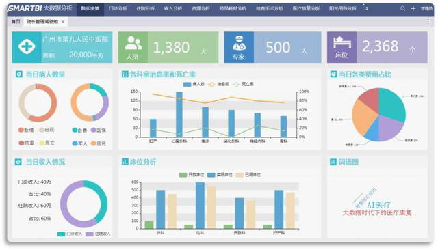 为了可以随时随地查看相应信息,查看医院经营状况,Smartbi做了一个院长决策可视化系统,可以数据辅助院领导做出正确决策。