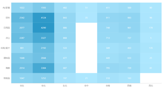 热力图是指用x轴和y轴表示的两个分类字段确定数值点的位置,通过相应位置的矩形颜色去表现数值的大小,颜色深代表的数值大。