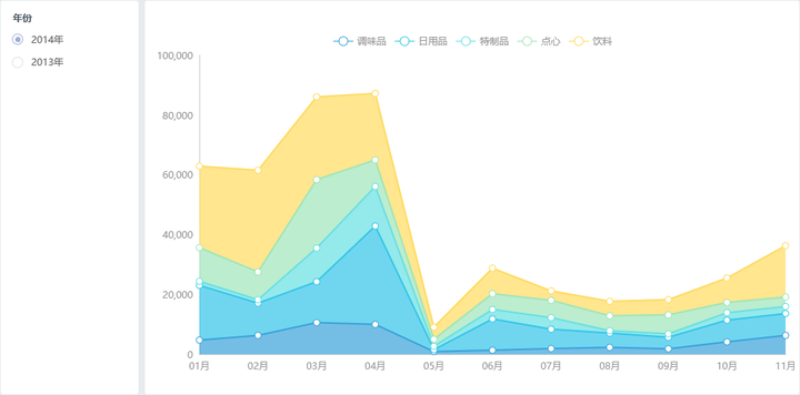 面积图又称区域图,是在折线图的基础之上形成的, 它将折线图中折线与自变量坐标轴之间的区域使用颜色或者纹理填充。