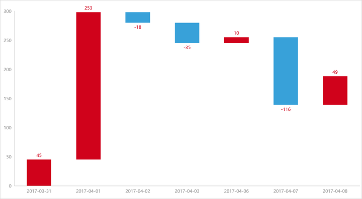 瀑布图采用绝对值与相对值结合的方式,来表达数个特定数值之间的数量变化关系。