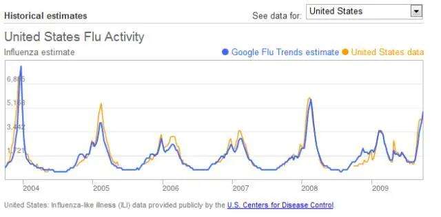 2008年,Google第一次开始预测流感就取得了很好的效果,比美国疾病预防控制中心(Centers for Disease Control and Prevention)提前两礼拜预测到了流感的爆发。但是,几年之后,Google的预测比实际情况(由防控中心根据全美就诊数据推算得出)高出了50%。