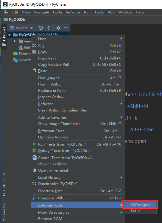 如下图点击新建的Project "PyQt5"项目,右击在下拉菜单“External Tools”选中打开QtDesigner