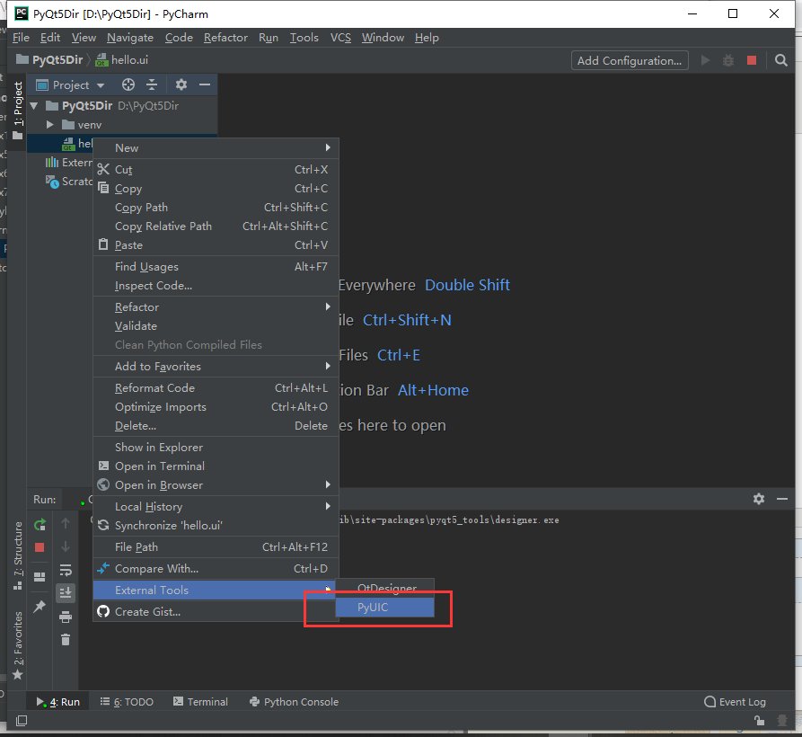 如下图,使用PyUIC将hello.ui文件转换为hello.py(选中保存的hello.ui,右击在下拉菜单中选中“External Tools”中的PyUIC)