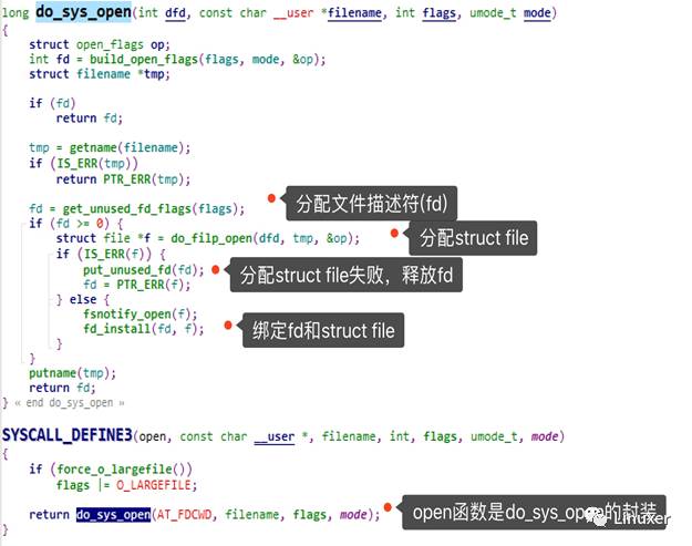 Linux的代码非常清晰,open函数实际上调用的是do_sys_open。“打开文件”的过程分为: