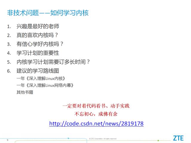 中兴通讯研发人员有几万人,部门结构特别复杂,我们也不可能自己去写一个Linux的操作系统,一般都是将Linux用起来就行。做内核的人就是给各个产品线上做Linux技术支持,做技术支持时非常重要的一点就是要搞清楚组织对象、人员关系和职责,搞清楚以后才会知道你协调资源的时候找谁,谁说了算。你看《红楼梦》一书《葫芦僧判断葫芦案》一节,有个门子,一上来就说我到某个地方去,一定要把地方上所有家族和当官的关系搞清楚。你们到公司里面去上班的时候,这一点也是非常重要的,特别是大公司,你一定要知道服务对象的组织关系和人员职责。