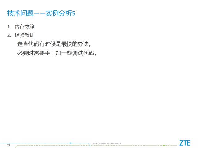 第五个案例是内存故障,经验教训是走查代码有时候是最快的办法,必要时需要手工加一些调试代码。在解决这个故障时,我通过走查代码的方法,找到了一个问题。但是并不确定已经修复了问题。然后在内存管理模块中我写了一个工具,加了一些调试代码,把分配和释放的地方都管理起来,去进行跟踪,把调动链取出来,一看正好是我走查代码以后,修改的地方,说明前期走查代码已经修复了问题。这样大家心里面就有底了,后来故障不复现了。所以对内存故障来说,走查代码是最好的,然后适当的增加一些调测手段。