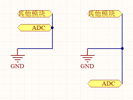 如果ADC引脚如左图连接,则会ADC读值的时候会出现过高的情况(ADC≈80);如果ADC如右图连接,读值时则接近0(ADC≈8),比较准确。