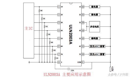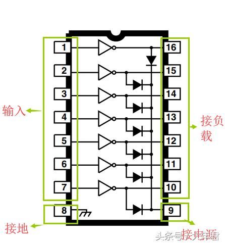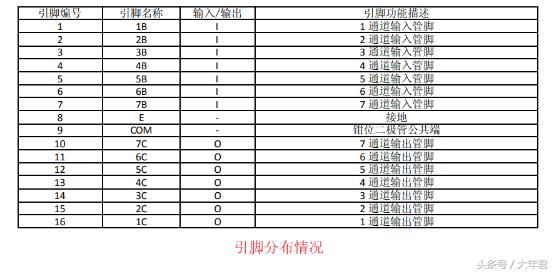 ③每一路达林顿管串联一个 2.7K 的基极电阻,在5V的工作电压下可直接与 TTL/CMOS 电路连接,输入兼容 TTL/CMOS 逻辑信号;