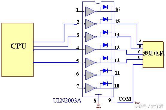 ULN2003A特点下面介绍一种驱动步进电机的驱动器ULN2003A,它是一种新型的七路高耐压、大电流达林顿晶体管驱动IC,在继电器驱动、显示驱动、电磁阀驱动、伺服电机以及步进电机驱动电路当中都会用到,ULN2003常见的封装有DIP-16、SOP-16、TSSOP-16三种,而ULN2003A我们经常看到的是DIP-16或者SOP-16的。它有16个引脚,1到7是输入引脚,10到16是输出引脚,8号引脚是接地端,9号引脚是钳位二极管公共端。