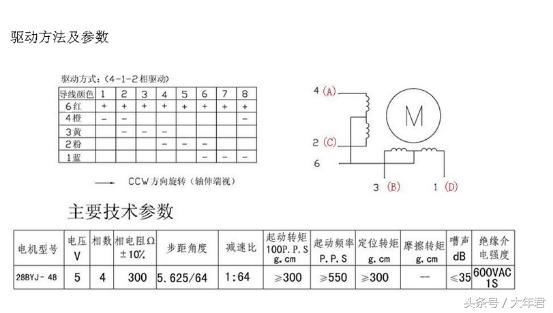 以四相八拍步进电机为例,该步进电机为四相步进电机,采用直流电源供电,只要对步进电机的各相绕组按合适的时序通电,就能使步进电机步进转动,四相八拍运行方式即 A-AB-B-BC-C-CD-D-DA-A,下面是具体参数