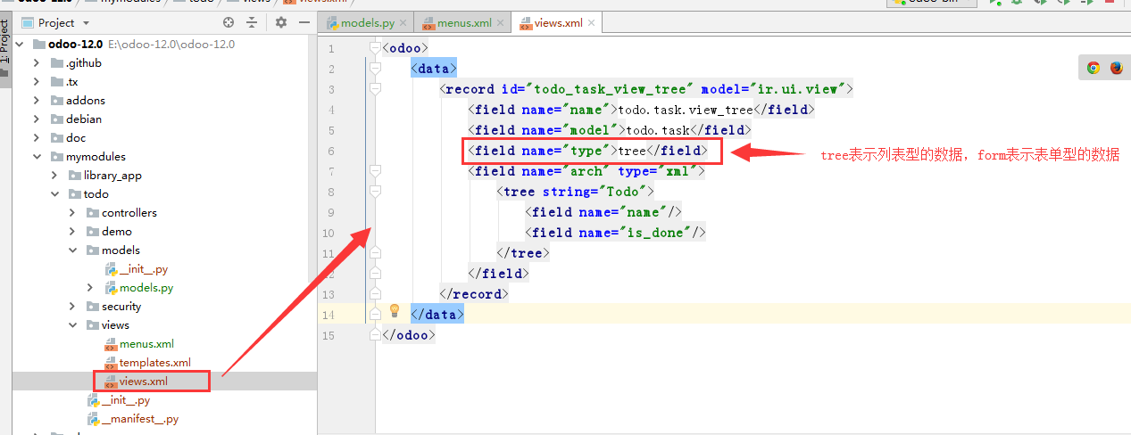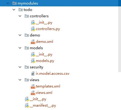 二、使用scaffold命令创建新的模块:python odoo-bin scaffold todo mymodules(todo为模块名称,mymodules为模块存放位置)
