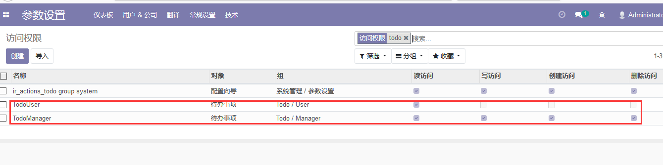 ps:odoo12 模型需要赋权限才能正常的访问,否则菜单不会再界面显示的。