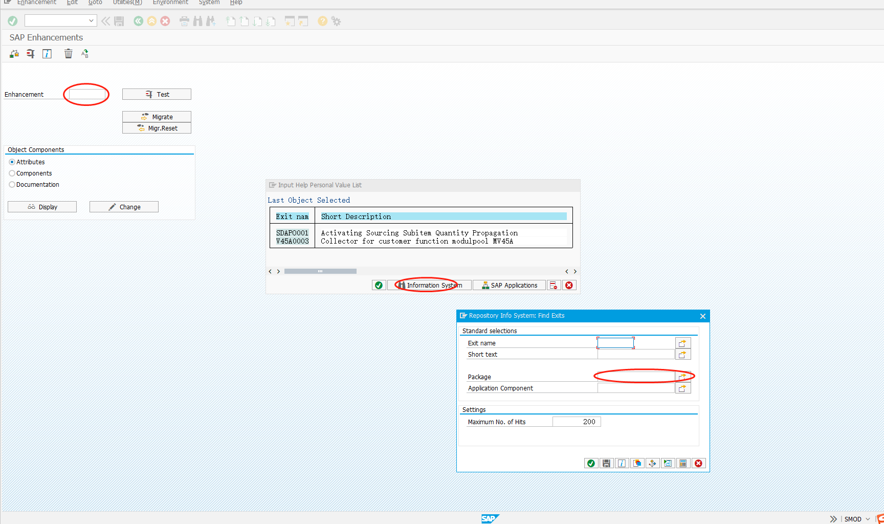 3.进入smod 作业,用第二步骤中所在的包,查看包里面的出口函数,这样就能大概找出对应程序的增强出口函数