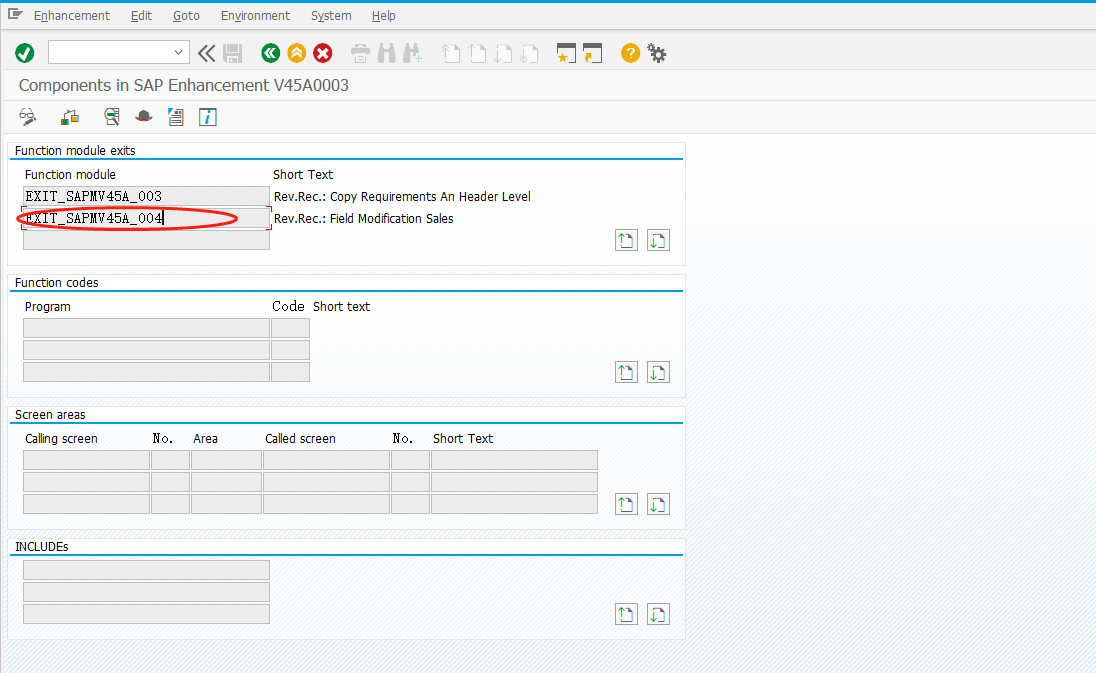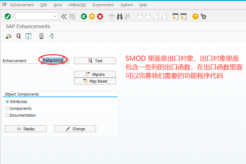 1.找到二代增强的出口对象之后,需要完善对应的功能代码。这里的T-code是SMOD 。