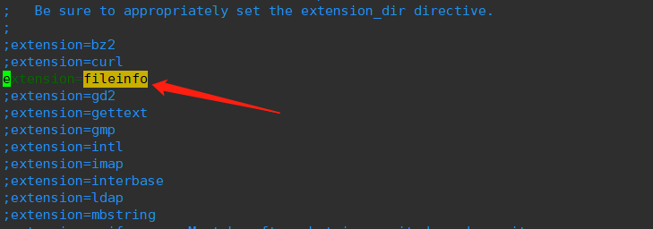 如果没有找到如图类似的代码,可以自己手动在文件尾添加:extension=fileinfo.so,保存退出。