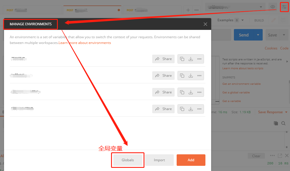 第一种方法:再界面右上角-MANAGE ENVIRONMENTS
