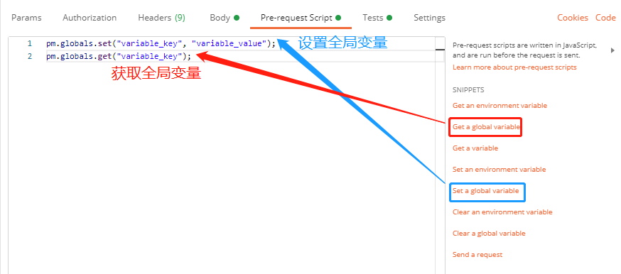 第二种方法:再Pre-requests Script和Tests选择右侧javascript的"Set global variable"[设置全局变量]和"Get a global variable"[获取全局变量]