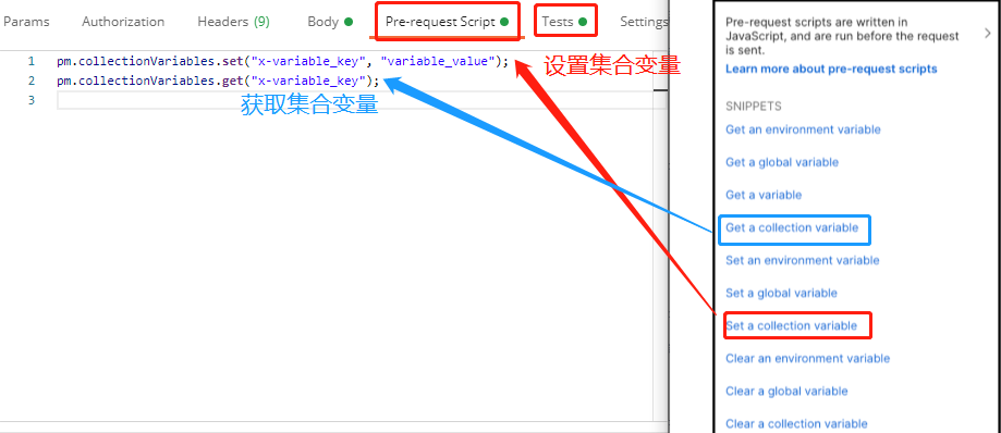 第二种方法:再Pre-requests Script和Tests选择右侧javascript的"Set a collection varibales"[设置集合变量]和"Get a collection variables"[获取集合变量]