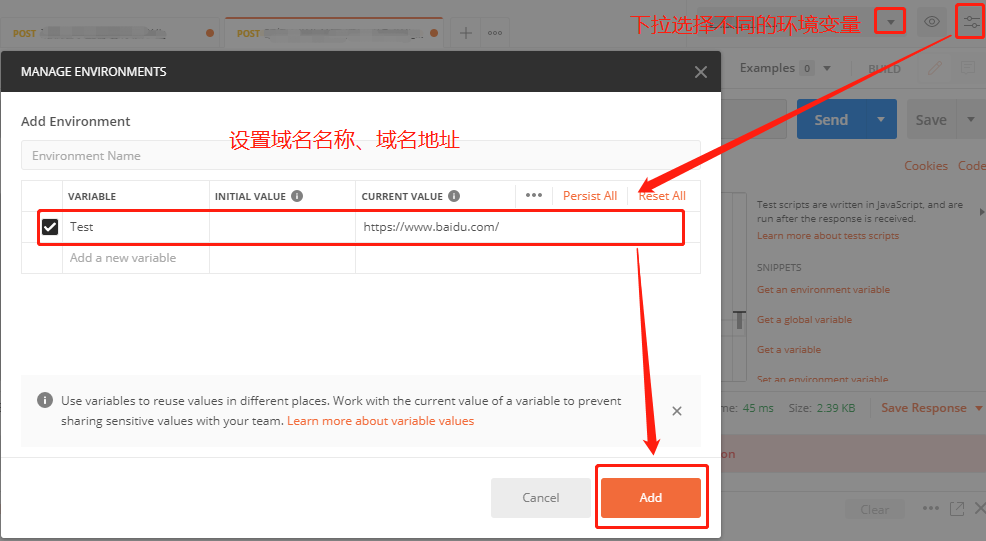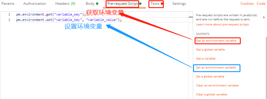 第二种方法:再Pre-requests Script和Tests选择右侧javascript的"Set a environment varibales"[设置环境变量]和"Get a environment variables"[获取环境变量]