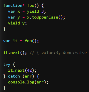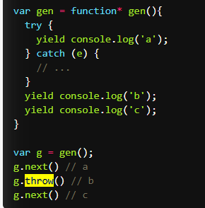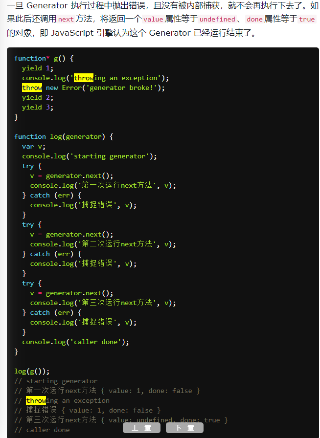 6、generator遍历器tGenerator.prototype.throw,遍历器对象的throw,在f.throw(e),如果generator里面有catch会被内部捕获,如果内部没有,会被外部捕获,如果内外都没有,会报错停止,