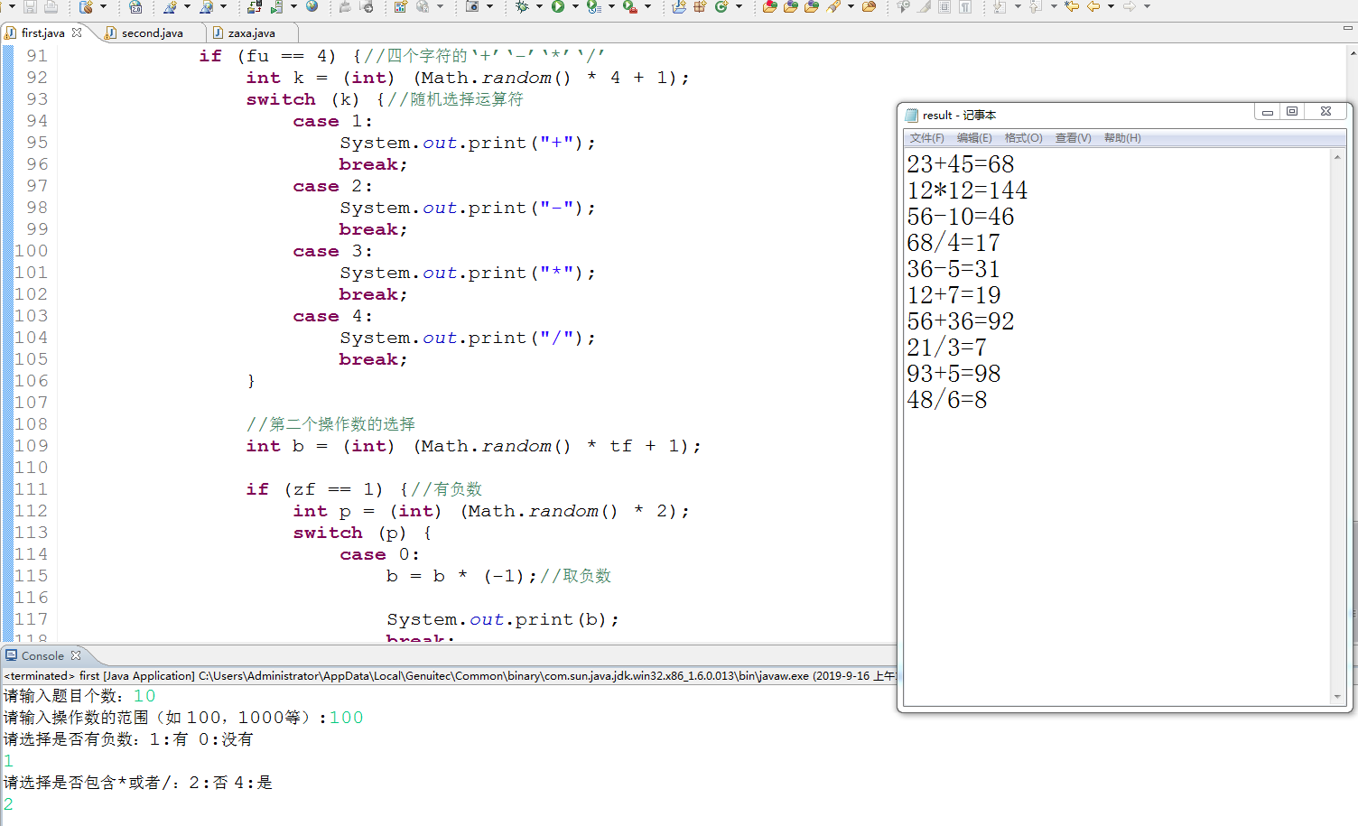 (1)自动生成10道100以内的2个操作数的四则运算算式(+ - * /),要求运算结果也在100以内