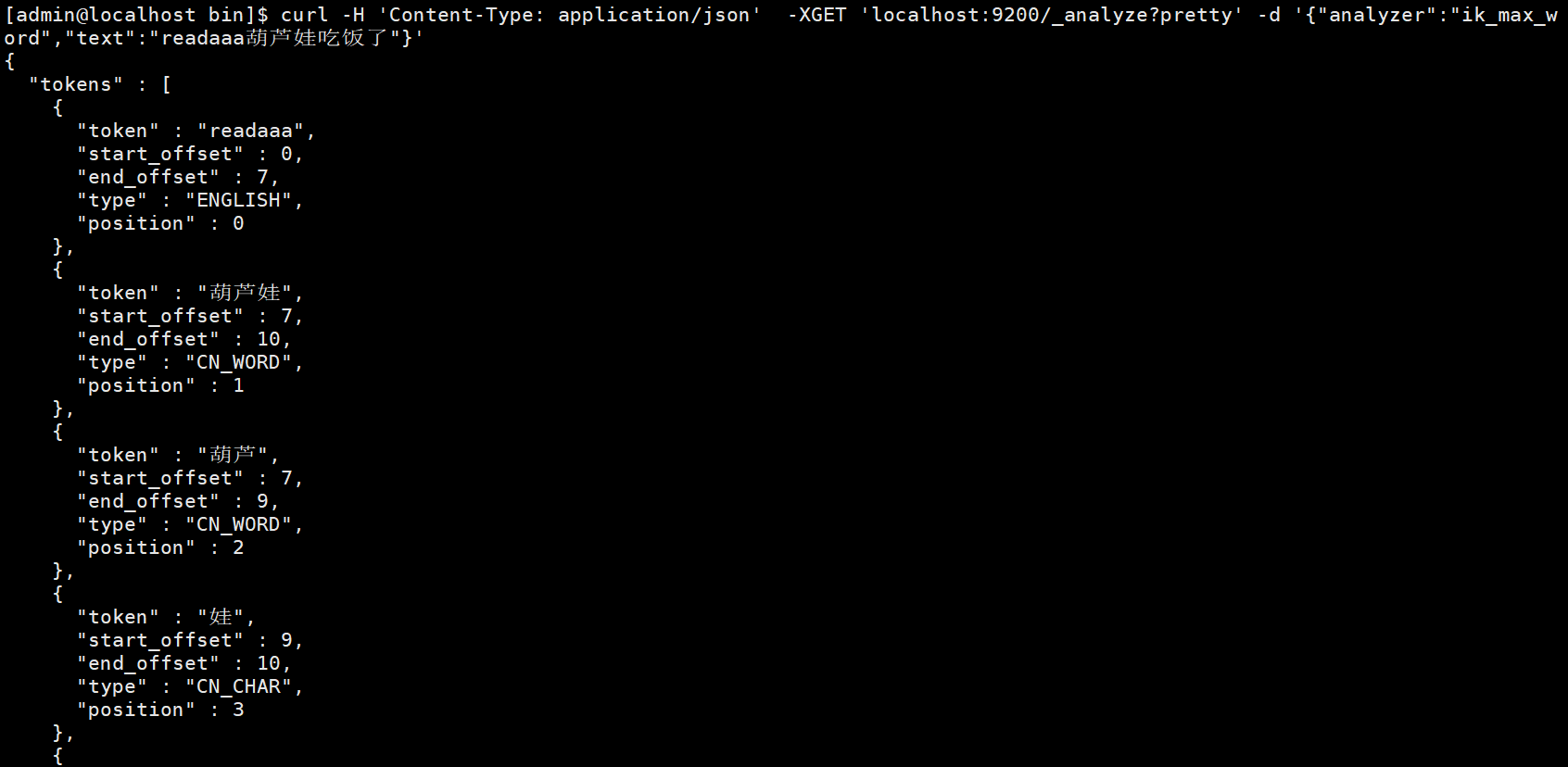 curl -H 'Content-Type: application/json' -XGET 'localhost:9200/_analyze?pretty' -d '{"analyzer":"ik_max_word","text":"readaaa葫芦娃"}'