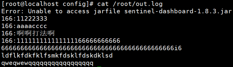 修改配置如下,这里只是举个栗子,具体的按照自己实际情况来,比如在/root下建一个日志文件out.log,里面随便写点东西试验一番: