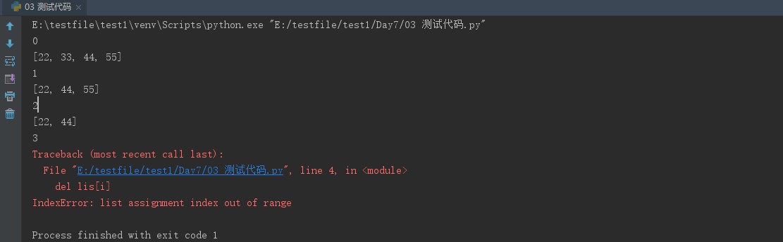 1 lis = [11,22,33,44,55] 2 for i in range(len(lis)): #range顾头不顾尾,从0开始数, 3 print(i) #len()获得的元素数为5 4 del lis[i] 5 print(lis)