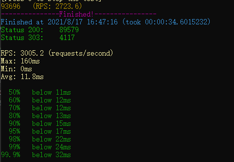 平均响应时间在3MS,这可比单线程的11MS快了整整8MS!!!比直接New一个线程的响应速度要快了4MS!