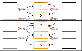 生活中有些场景也能看到递归,递归的前半段是先一路走到底,后半段是再原路返回的过程。现在假设你坐在电影院的座位上,朋友迟到问你在第几排,可是你的电影票丢了,这时候你该怎么办?我猜你就会问前排的人他在第几排,那如果前排的人也不清楚呢?这时候他也继续往前问直到到第一排,当传到第1排时,因为前面没有人就回说在第1排,后排的人一听就知道自己在第2排,然后依次往后报数,最后传到你这边,只需要将听到的排数加1就得到你的排数啦,然后你就回复给你的朋友_。现实中很难遇到一直往前问的情况,这里只是为了更好地说明。整个过程如图2-1所示,图中起点和终点都是A,序号1到序号4对应递归的前半段(递),序号5到序号8对应递归的后半段(归)。