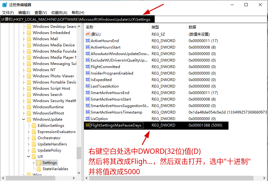 ctrl + r ---> regedit---> \HKEY_LOCAL_MACHINE\SOFTWARE\Microsoft\WindowsUpdate\UX\Settings--->